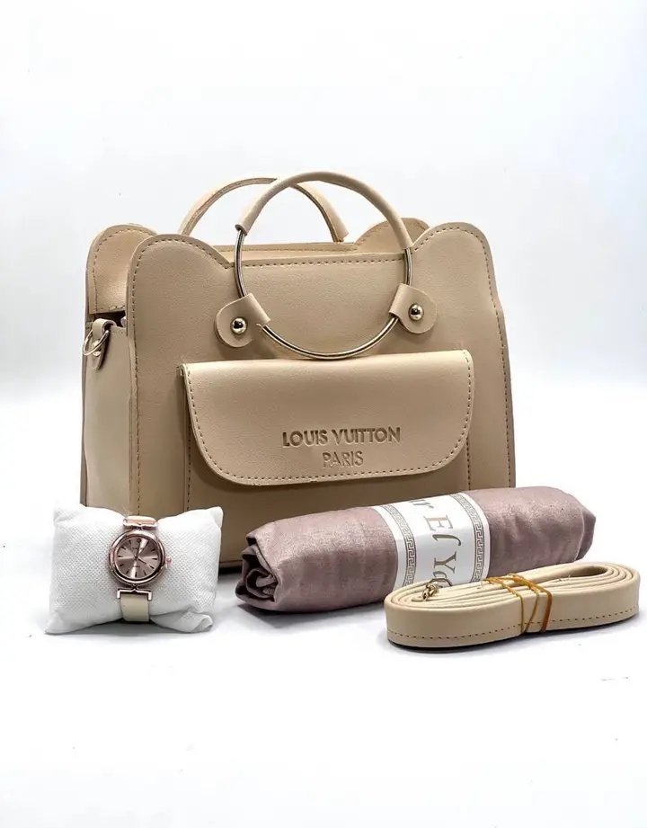 حقيبة نسائية فاخرة من شانال بلون باج ، بتصميم فني ومقبض دائري معدني، مثالية للإطلالات الراقية. مع الخمار و الساعة هدية